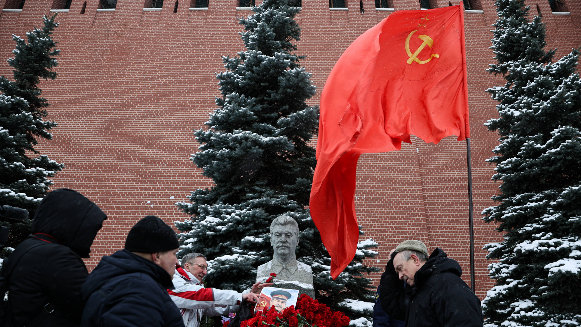 Am Kreml schmücken Mitglieder der russischen Kommunistischen Partei Stalins Büste anlässlich seines 70. Todestages.